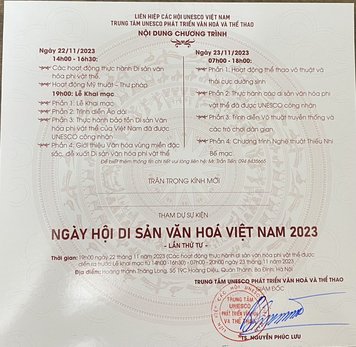 ( vanhoanghethuatvietnam) Hưởng ứng “Ngày Di sản Văn hoá Việt Nam lần thứ IV năm2023” và tiếp nối thành công của Ngày hội di sản văn hoá Việt Nam Lần I,II,III, tại không gian khu di tích, di sản văn hóa Hoàng Thành Thăng Long – Hà Nội (số 19 Phố Hoàng Diệu, Ba Đình, Hà Nội), được sự đồng ý về chủ trương của Liên hiệp các Hội UNESCO Việt Nam, được sự cho phép của Thành ủy và Ủy ban Nhân dân Thành phố Hà Nội, Sở Văn hóa và Thể thao Thành phố Hà Nội, Trung tâm UNESCO Phát triển Văn hóa và Thể thao và Trung tâm bảo tồn di sản Thăng Long - Hà Nội sẽ phối hợp tổ chức chương trình văn hoá nghệ thuật đặc biệt: “Ngày hội Di sản văn hoá Việt Nam Lần IV - 2023”, diễn ra trong 02 ngày 22 và 23 tháng 11 năm 2023.