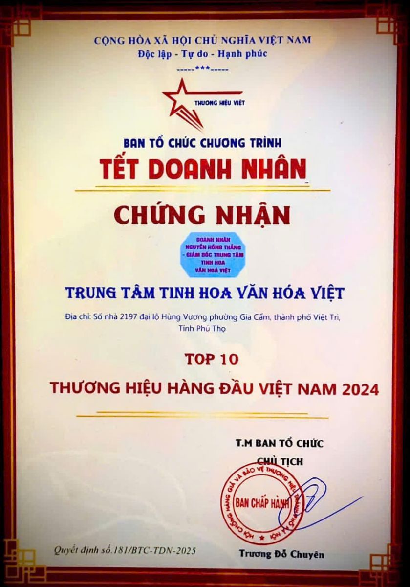 Top 10 Thương Hiệu Hàng Đầu Việt Nam năm 2024 một lần nữa khẳng định sự uy tín của thương hiệu Trung Tâm Tinh Hoa Văn Hóa Việt tại thị trường tỉnh phú thọ và các tỉnh khác trong cả nước.